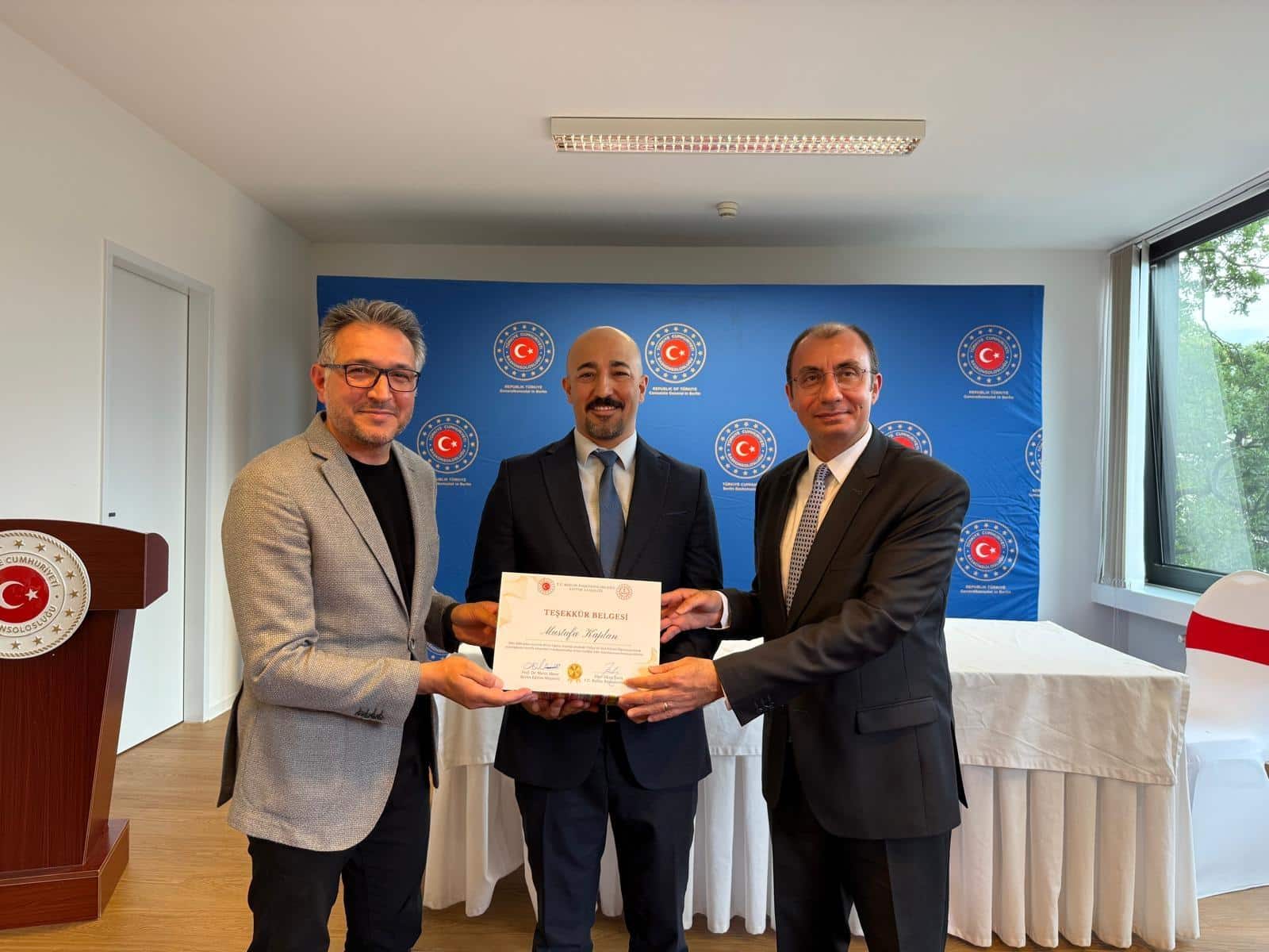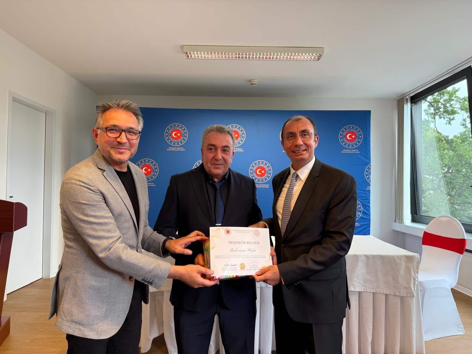 T.C. Berlin Başkonsoluğunda, Ataşeliğimizde görev süresi dolan öğretmenlerimiz Bahrinur Polat ve Mustafa Kaplan için bir veda programı düzenlendi. Özverili çalışmaları için kendilerine teşekkür eder yeni görevlerinde başarılar dileriz.